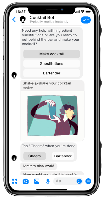 I developed the product from concept to prototype, including research, interviews with users, designing conversation flows, writing dialogues and testing cocktail recipes.