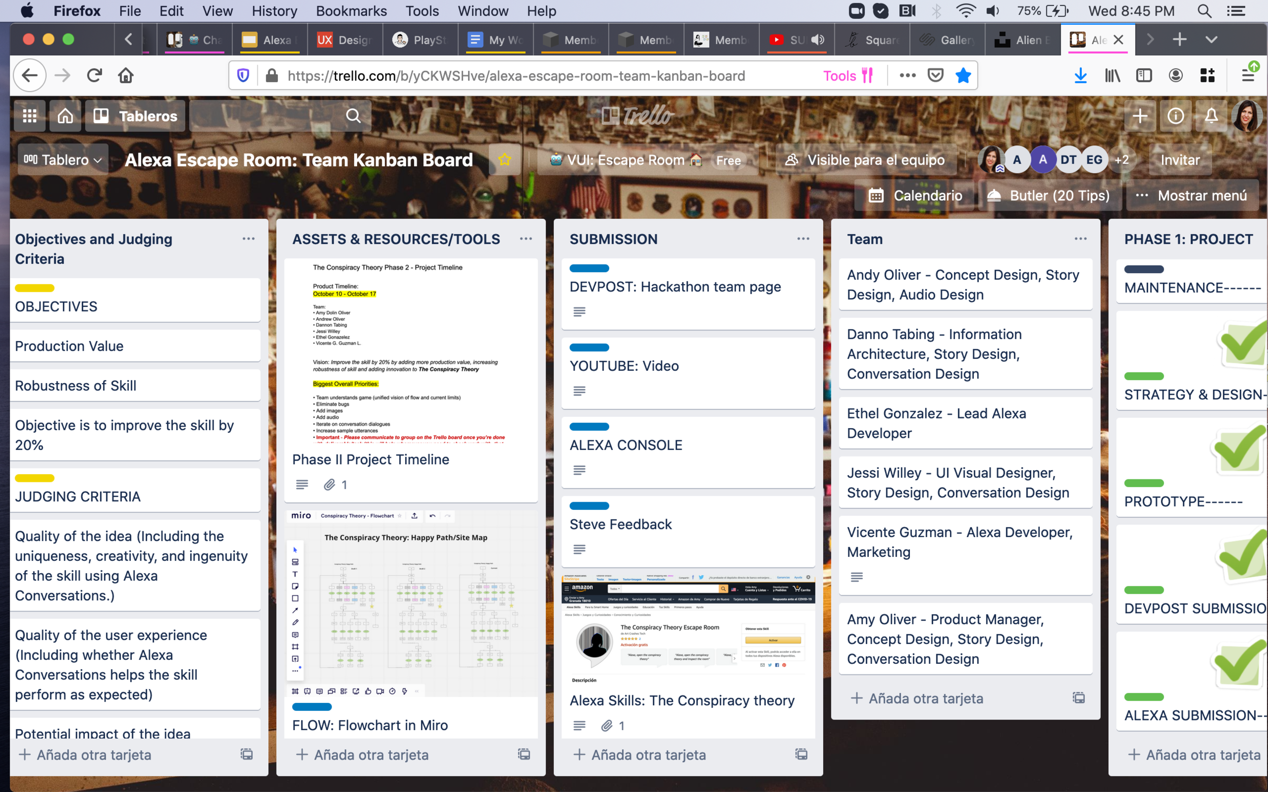 My first task was to get everyone aligned on the project goals, offer roles, put an agile work framework in place and give everyone shared access to resources (Slack, Trello, Miro, Google Drive, Devpost, Alexa Console). I used a mix of Lean Startup + Design Thinking + Agile-Kanban-Scrum practices, with an eye on Systems Thinking and Exponential Organizations.