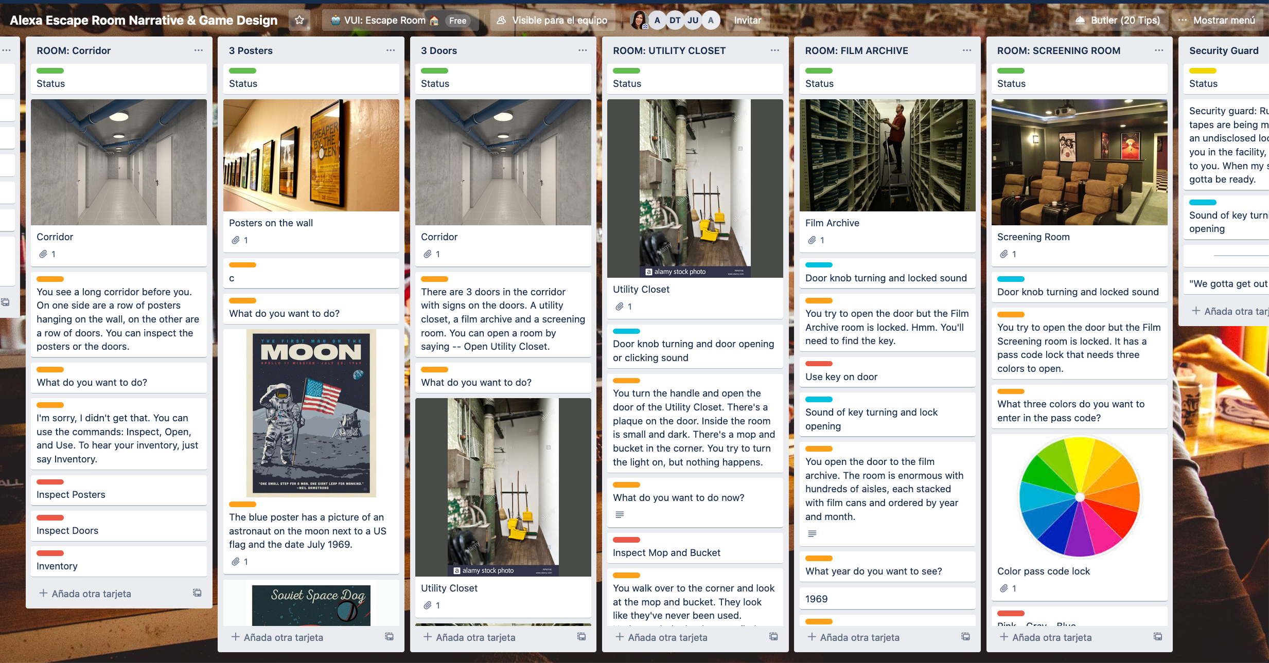 I researched requirements and constraints on the internet, met with project mentors, talked to game players and consulted with the team. Danno and Jessi investigated other Alexa escape room games while Ethel and Vicente scoured blogs and forums for information on developing with the beta version of Alexa Conversations.
