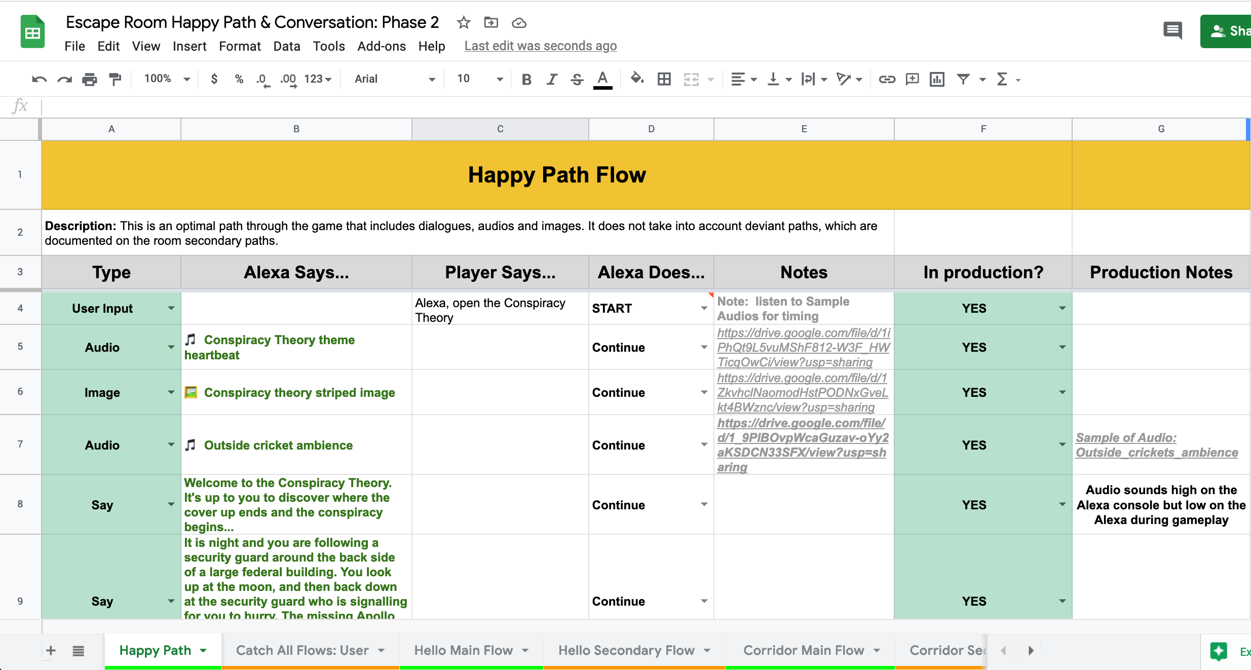 We all believed we would be using a conversation design platform like Botmock or Botsociety to pass work between the designers and developers. Unfortunately, as Alexa Conversations is a beta version, integration did not exist. I took Hillary Black’s Google Sheets chatbot design template and with her kind permission converted it into a voice design template we called the Happy Path. This document stored all dialogues, images, audios and divergent paths. This, paired with voice flow drawings in Miro, solved that need.