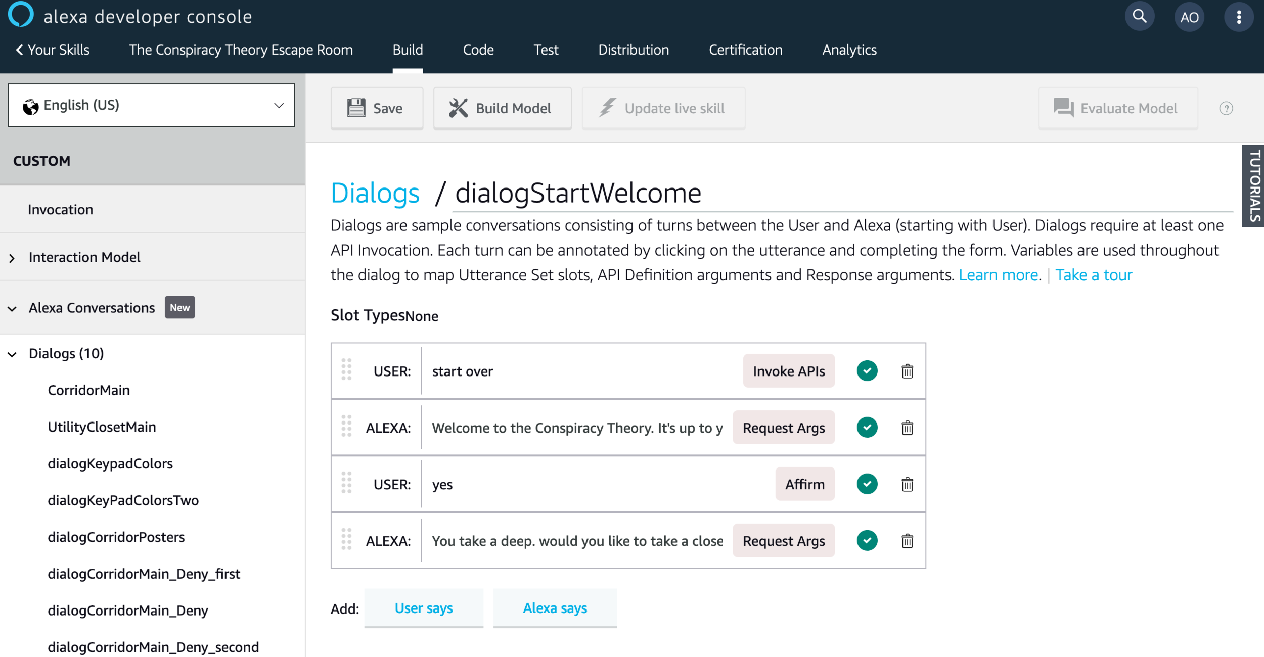 To work around the game ending, I wrote two conversation paths: one which started the game again and another which used an Alexa designated word to kick the player out of the skill.