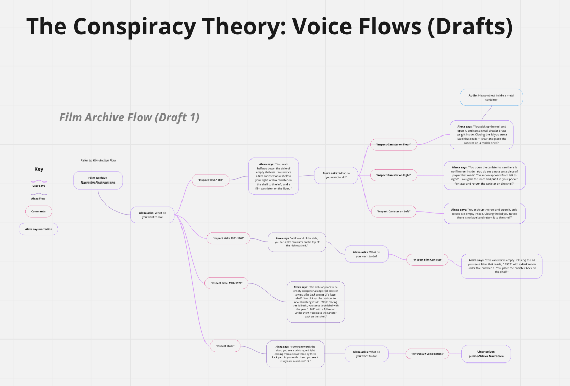 I knew I wanted to create a voice-first design and at the time was obsessed with Rusty Lake’s surreal escape room universe. My brother Andrew was wrapped up in understanding conspiracies, one part exploring the unknown but mostly fascinated by fanatic followers.