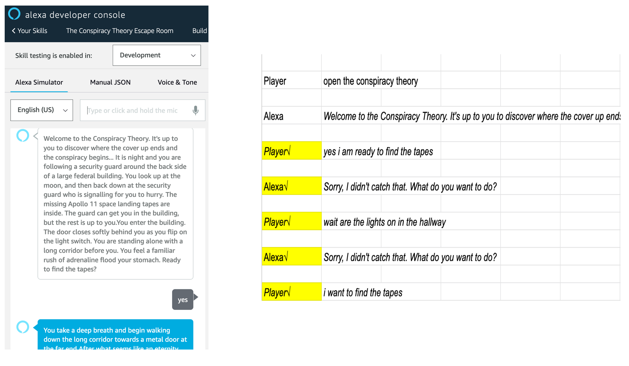 I ran two periods of usability testing between certifications with ten players. These were 20 minute recorded sessions held in Wizard of Oz fashion where I controlled responses from the Alexa console. Insights and bugs were incorporated into the bug log and discussed during the Retrospectives.